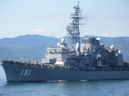 | まずは今回の1番人気、ひゅうが型護衛艦の2番艦DDH-182「いせ」。 「海上自衛隊初の空母か!?」と報道等で何かと話題になりましたので、ご存じの方も多いのではないかと思います(おおすみ型の竣工時にもそんな騒ぎはありましたが)。 基準排水量13.950t、搭載機はヘリ4機(最大11機搭載可能)。 海自はあくまでも「DDH=ヘリコプター搭載護衛艦」として分類していますが・・・まぁ自衛隊が実質軍隊なのと同じく、この艦も普通に見れば「ヘリ空母」でしょう。 1万超ということもあり、他の艦と比べてもその大きさが際立っていました。 今回の展示訓練では大阪港より出航した「いせ」。甲板上には抽選に当って搭乗できた羨ましい方々の姿が見えます。 |