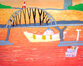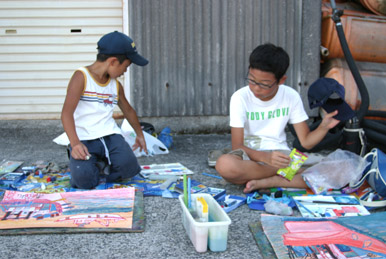 次第に日が傾きはじめ、空や船がとても綺麗に染まりはじめてきました。 ![]() 絵が完成したあとは、夕日を見ながらのんびりと少し休憩です。 ![]() 最後に、夕日と船の前でみんなで記念撮影。 暑いなか、ふだんより長い時間のお絵かきで疲れているはずの子供たちですが、 皆さん夕日に負けないまぶしい笑顔です。 笑顔の溢れる楽しいスケッチ会となりました!