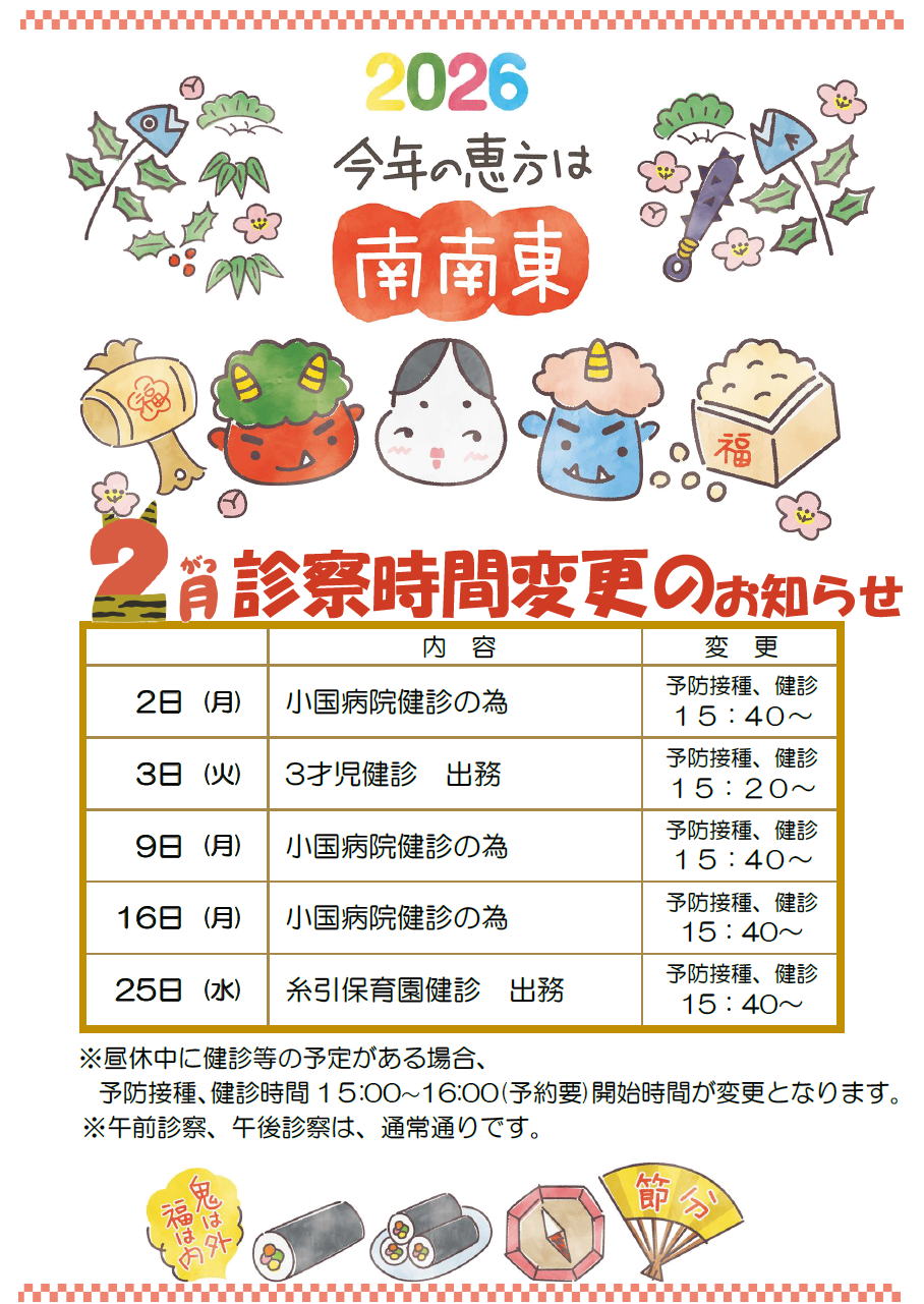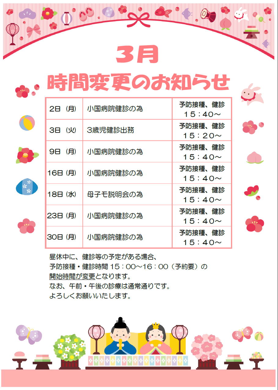 | 2 昼休中 小国病院健診の為、 予防接種健診の 開始時間は15:40〜 |