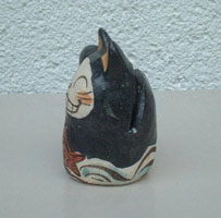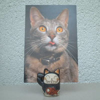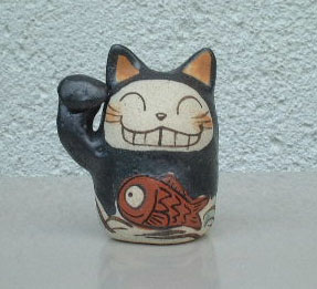 2月の猫は・・・<丸善なんばOCAT店>で開かれた『来る福、招き猫展』で ゲットしてきた猫さんで渡辺志野さんの作品です。 ニカッと歯を見せて笑う・・・ちょっといたずらっ子のような笑顔が可愛いですね♪ 招いている右手にも力が入っていて、元気いっぱい!という感じ・・・「今日も一日、頑張るぞ〜!」(笑)