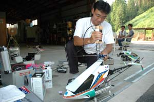 ヘリ部会の初心者メンバーにヘリコプターの特色について指導中