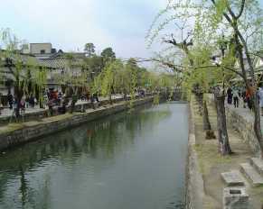 真ん中に川をはさんで両側に古い建物が建っている。川沿いには桜、そして柳のやさしい葉っ