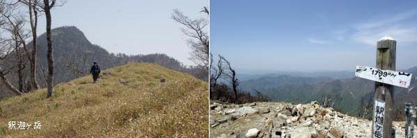 それにしても、暑い。新緑の芽吹きはまだなので、木陰もほとんどなし。途中、登山道脇にザックが転がっていた。誰もいないのに?と見れば”重いので置いていきます”とメモが添えてある。あと釈迦ヶ岳山頂まで一時間以上あるのに。水は?食料は?と思いつつ通過。暑さでバテられたのかもしれません。