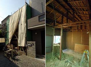 七坪の家/解体 敷地面積が12坪で、ケンペイ率は60%。つまり、実質の建物面積が7坪となる家の設計もいよいよ追い込みです。併せて、古家の解体も始まりました。とにかく狭いので、解体工事も重機に頼らず、手作業となりました。好天が続いてくれるので、作業される方もがんばってくれているようです。中を見せてもらうと、丁寧に住まれていた様子。いくら解体するといっても、この場を引き継いでいくことを考えれば、きちんと住んでおられた気配を感じると安心です。 今日は暑い日でした。