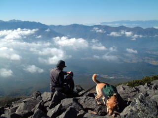 10月中旬から張り出した高気圧が一転、明後日から寒気がやってくるというので、こりゃいかんと夕方4時高槻出発、夜10時に清里着。翌朝、4時起床で、6時に登山口である観音平から登り始めました。目的の山は八ヶ岳蓼科連峰の南端に位置する編笠山(2524m)。途中、日の出を背に浮かび上がった富士山に「おー!わぁー!」と叫んだのも束の間、その後は息絶え絶えになり、無事山頂に着いたのが10時半。運動不足の体にはとてもきつかった。しかし、振り返れば、南アルプス、いや、、中央アルプス、北アルプスまで見ることができるじゃあーりませんか!さらに、背後には権現岳、赤岳と八ヶ岳主峰が迫まっており、あっというまに疲労回復。岩石が敷き詰められたような特異な頂上を持つ編笠山、本当に素晴らしい眺望でした。