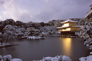 22日朝、天気予報通り、外は真っ白。ムクとの散歩途中、スリップして発進できない車があちらことちらにあるので、今日は工事どころじゃなさそうです。「氷室の家」のガラス搬入日だったのですが・・・。とはいっても、仕方がないので、雪で混乱する街を抜け、雪で輝くものを見つけようと出かけることにしました。その文字通り、向かった先は金閣寺。普段は行こうと思いませんが、昨晩、天気予報を見ながら、チラッと頭に浮かんだ雪の中で輝く金閣寺、という絵葉書的映像を本当に見たくなりました。現地に着くと、同じ発想の人々がたくさんおられて、シャッター乱れ打ちです。私も負けじとワンカットに対し3段階露出で、「西日に輝く金閣寺」を撮影しました。撮影スポットには、人が群がっているのですが、他の人の邪魔にならないよう頭を下げたり、一瞬にして記念撮影を済ませ次の人に譲ったりと、めったにない美しい景色をみんなで楽しむといった雰囲気で、気持ちよい時間を過ごすことができました