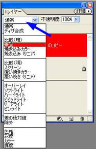 ”背景コピー”を選択している状態で、描画モードの▼をクリックして表示を”通常”から”乗算”に変更します。