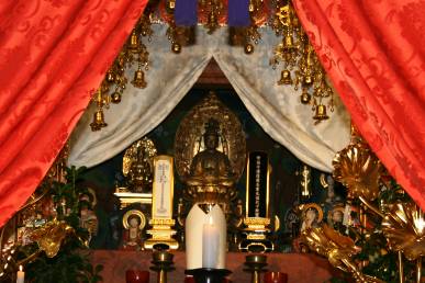 御本尊 聖観世音菩薩 常福寺の御本尊は「聖観世音菩薩」(しょうかんぜおんぼさつ)様です。脇仏様は十一面観世音菩薩様と地蔵菩薩様。その周りに十六羅漢様が坐しておられます。日々皆様方の安寧とご多幸をお願いし、お守りいただいております。 いつでも親しくお詣り下さい。合掌
