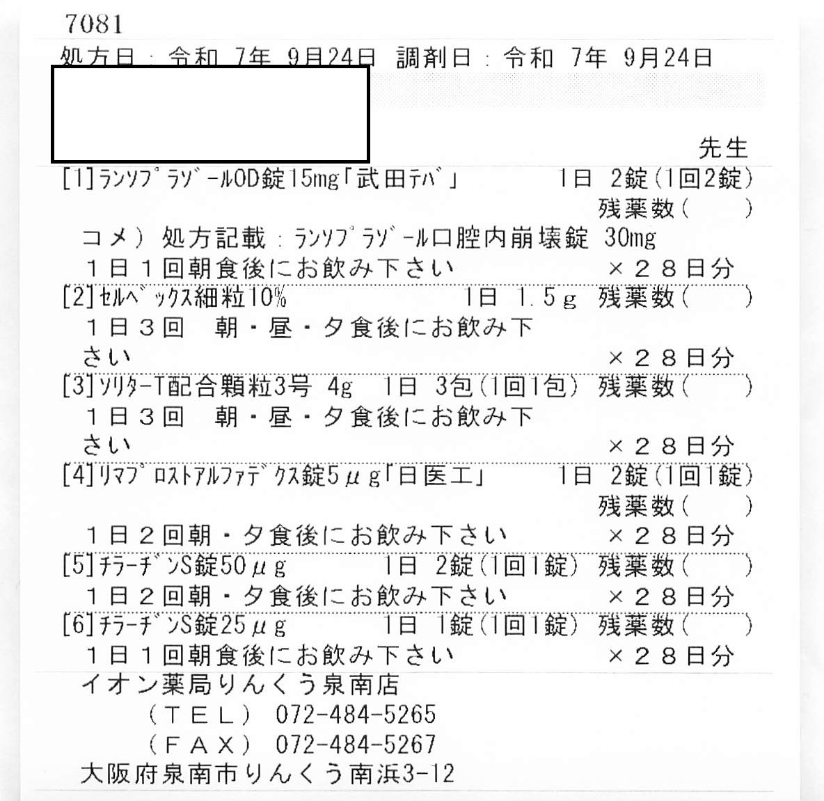 250724 樽谷医院、りんくうイオン薬局でもらう。テプレノン在庫無しでセルベックスに替えてだしてもらう。 |