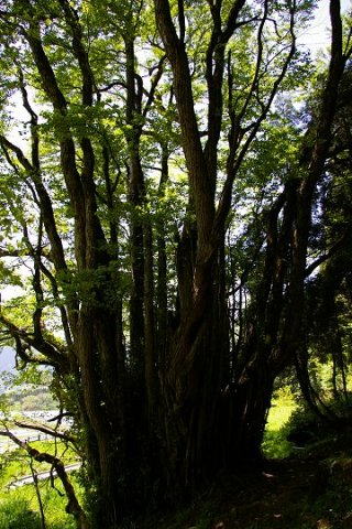 見に行きましょう。駐車場の在る小さな公園から僅かに登れば見事な枝張りのカツラの巨木 樹高27.3m、幹周り14.5m、枝張りは東西に24m南北に26mもあるそうだ^^)樹齢は200年 〜400年とも言われています。主幹は朽ちてますが支幹が100本近く立ち上がっています。 その後ハチ高原に向けて走り但馬アルペンロードの標識から瀞川氷ノ山林道の始まりです。 |