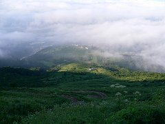 | 写真を撮るには少し暗すぎ、夜明けを待つ事にしました。 午前5時少し過ぎた頃目覚め、早速ユウスゲの撮影です 30分も撮影したでしょうか、今度は陽が上らない内に山頂 目指して登ります。5合目辺りで既に降りられて来る登山者と 擦れ違います。名物^0^)の夜間登山で登られたのでしょう。 7合目辺りで振り返ると、麓からガスが湧き上がって来ます。 |
