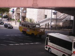 さて、ハーバーランドを後にして、2号線に戻り、歩道橋を渡ってたら偶然にも遭遇しました。 分かります?この黄色い車。船みたいですが、それもそのはず、水陸両用なんですよ。 |