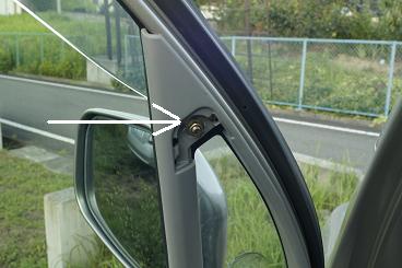 まずは3角窓のフレームを外します。 矢印部分に付いてるカバーを外すと、10mmのナットが出てきますので、外します。 |
