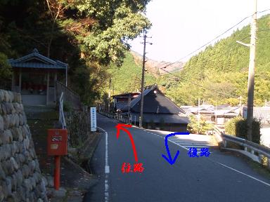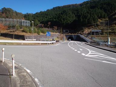 写真A 生野トンネル前です。 トンネルの方へ行くと、下りだし距離も短いのですが、男らしく旧道で山を越えます。 右(正面)がトンネル、左側が旧道です。 |
