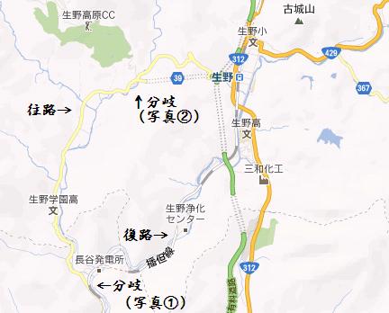| 39号線に入ってしばらく走ると分岐があります(下の写真参照)。 行きは39号線で、生野トンネル方面へ、帰りは川(播但線)沿いに走りました。 |