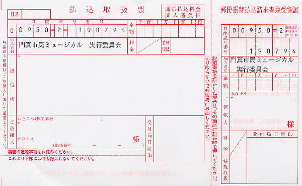 ※上記振り込み用紙をプリントアウトしてのご使用はできません!ご面倒ですが、郵便局で上記内容をご記入ください。 |