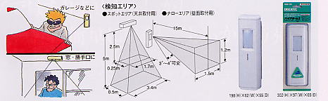 人体検知器付き送信部 ナロー・スポットの2検知エリアを選択可能。複数台のセンサー設置時状況に応じて発報させたくないセンサーを選択できます。検知作動は電池を入れてから約1分ごに開始。電波到達距離は100m 単三アルカリ電池 3個使用 小売り価格 25.000円 |