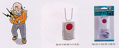 自動通報装置 単体であればボタン一つで自動通報が可能です。上記の受信部とセットで使うと自動的に家族の電話機や、携帯電話に自動通報します(最大5件)。 電波到達距離は100m 小売り価格 68.000円 |