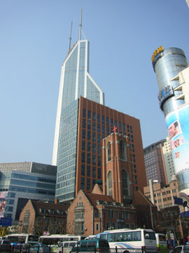 あまりに空気が悪いのでスーパーに入っている薬局でマスクを買いましたが、10元弱。高いですよね。こんなに空気が悪いのに中国の人はほとんどマスクをしていません。タクシーで旧フランス租界へ行きました。徐家匯駅周辺はなかなかにぎやかです。徐家匯天主教会へ行きましたが、中は見学できませんでした。1910年、租界時代に建った上海最大のカトリック教会です。
