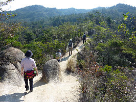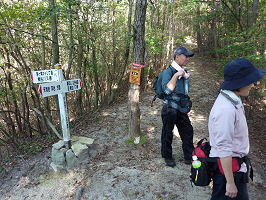 ゆっくりと展望を楽しんだ後、団体の登山者が次々と登ってきたので、耳岩に向かう。さらに今回はパスする竜王山との分岐である白石峰から下山に移る。稜線に出て以降しばしば見かける“松茸山につき立入禁止”の表示とロープがこのあたりからさらに多くなる。いっちゃんの話では、歩いていると松茸の香りがすることもあるらしい。鼻をクンクンさせてみたがわからなかった。