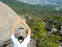 さらに歩いて天狗岩の直前で一度下ってから、本日のハイライトである天狗岩に登る。チムニー状の狭い通路などがあってなかなか楽しい。人間の小太郎もはしゃいでいた。登り始めて2時間ほどで到着である。ここで昼食の大休止とする。2頭の犬はみんなの弁当のおこぼれにあずかろうと走り回っては我々の顔と手元をじっと覗き込む。しつけがいいので、けっして箕面の猿のように略奪しようとはしない。そのしぐさが可愛いのでついついおにぎりの御飯などあげてしまう。カロリーメイトのチーズ味も口に合った様子。