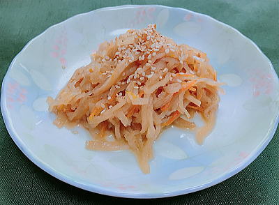 8月の献立 梅御飯 繊蘿蔔煮 とろろ汁 ![]() 暑さの厳しい季節、御飯に梅干しを炊きこむ事で さっぱり頂けます。 「繊蘿蔔煮」(せんろふに) ![]() 冷やした繊蘿蔔(切り干し大根)は、食が進みます。 |