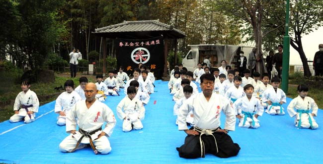 枚方市意賀美神社 4月21日 意賀美神社 展望台にて 武修館 空手演武 白帯 水色帯の四股突き 南光の型 ワンシューの型 古武道 棒術 古武道 ヌンチャク 棒術 VS トンファー ジュンサイ VS リンタロウ ダイチのアクセルキック