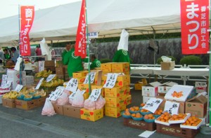 | 焼いもやとうもろこしの香ばしいにおいにつられて長蛇の列ができていました | 青果販売業の会員様のご協力で、旬の野菜や果物が並びます | |