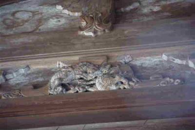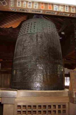 高台に建つ観音堂の前から、琵琶湖、市街地が見渡すことが出来て、心をなごませてくれる。観音堂の横には、百体堂、童子鐘、観音舞台がある。広い境内をどんどん北へ歩いていくと、武蔵坊弁慶が引き摺ったと伝えられている寺宝の「弁慶の引き摺り鐘(写真4)」がある。その横に「弁慶の汁鍋(写真5)」が展示されている。その横にこの鐘とは別に、近江八景の三井晩鐘で有名な鐘楼がある。この鐘は、重量が2250Kgで、江戸時代に鋳造され、重要文化財となっている。この横にどっしりとした檜皮葺きで、入母屋造りの国宝建築の金堂(本堂)(写真2)がある。これは、桃山時代の慶長4年(1252年)に、豊臣秀吉の遺志を受け正室の北政所が建てたものと伝えられている。この金堂の横に、三井寺の名前が生まれたと言われている霊泉が湧いている。霊泉の上に建つ閼伽(あか)井屋に左甚五郎の作と伝えられている龍の彫刻(写真3)がある。この龍には、琵琶湖へ出て大暴れしたために眼玉に五寸釘を打たれたという伝説がある。ここを通り過ぎると、三井寺のもうひとつの入り口である仁王門(正面入り口)(写真6)に出る。我々は、どうも裏から入って、正面から出たようだ。