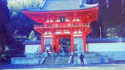 【解 説】 山麓から、表坂十八町といわれた約2Kmの旧参道を登って、標高約660mの御嶽山に朱塗りの山門(写真1)がある。山門前まで車でいくことも可能である。この山門は、以前は表坂からの参道にあったが、明治45年焼失し、再建後も昭和40年の23号台風で崩壊し、昭和55年に現在の所に再建されたものである。また、この寺は火災、落雷、台風の被害に幾度もあっており、特に大正2年の山火事による延焼で大講堂、根本中堂などほとんどを焼失した。その後、大講堂、根本中堂は再建された。