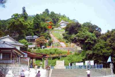 【解 説】 竹生島は、花崗岩の一枚岩で出来ており、周囲約2Km、最高所約112mで、島の周囲の水深は、約100mと琵琶湖の中でも一番深い所である。また、ここは古くから信仰の島で、僧侶と神官以外はここに住むことを認められていない。桟橋から売店の前を行くと、急な石段(写真1)があり、それを登って行くと、本堂(弁天堂)(写真2)に出る。この島の弁財天は、宮島、江ノ島の弁財天とともに三大弁財天の一つである。ここの弁財天は、高さ25cmの小さなもので、聖武天皇の勅令で行基が刻んだと言われており、秘仏になっている。