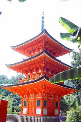 表の広場には、石造五重塔があり、これは鎌倉時代に建てられたものである。また、鮮やかな朱色の三重塔(写真3)の横には、どういうわけかバナナの木が青々と茂っている。石段の下には、唐門(国宝)、観音堂があり、豊臣秀吉を葬った京都東山の豊国廟から移築したものである。観音堂から廊下(船廊下、重要文化財)が都久夫須麻神社へと通じている。