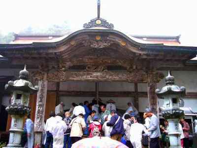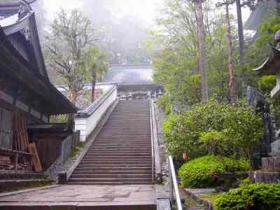 仁王門をくぐって参道を歩いていると、霧が出て来て、何か霊感を感じる雰囲気になって来た。参道(写真1)の石段を上がると、霧に包まれた本堂(写真2)が見えて来た。このお寺の創建は延暦17年(798年)で、桓武天皇が、ここに勅願道場として八堂伽藍を建立された時とされている。その後、弘法大師が夢のお告げを受けて、ここを訪れ修行しておられると、雌雄の白い鶴が羽を広げて黄金の地蔵菩薩を守護しながら老いた杉に舞い降りるのをご覧になり、弘法大師は霊を感じられ、三尺の地蔵菩薩を刻まれ、その一寸八分の黄金仏を胎内に納め本尊とされたと云われている。 このいわれの鶴の像は、本堂(写真3)の両側に置かれている。