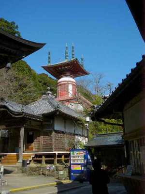 【解 説】 仁王門(写真1)をくぐり、女厄坂33段と男厄坂42段を登ると本堂(写真2)、本堂の左手に大師堂、鎮守堂、肺大師があり、その前に魚籃(ぎょらん)観音が祀られている。本堂の右手の還暦坂61段を登っていくと、ユギ塔(写真3)に出る。 このお寺は、神亀3年(726年)、聖武天皇の勅願により、行基が開創し、弘仁6年(815年)、弘法大師が42歳の厄除けの薬師如来を刻んで本尊にされたといわれている。それ以来、このお寺は厄除けの根本道場として、朝廷から町人まで多くの人々の信仰を集めてきた。その後、文治4年(1188年)の火災の時に、本尊は自ら西の玉厨子山へとび、後醍醐天皇が堂塔を再建され、新しい薬師如来を安置されると、再びこのお寺戻って来られ、後ろ向きに本堂に入られたと云われている。そのため、本堂には現在2体の薬師如来が祀られていて、「後ろ向き如来」は、本堂の裏から拝むことが出来る。