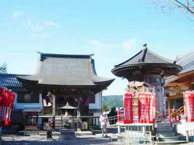 【解 説】 仁王門(写真1)を入ると、左に手水場、右手に聖天堂(写真3右)、鐘楼があり、正面右手に本堂(写真2)が建つ。本堂は、昭和53年(1978年)に建てられたもので、格天井には風景画、動物画、生物画、仏画など様々な絵が描かれている。本堂の左には水天宮、鐘楼の奥に大師堂(写真3左)がある。仁王門を背に左手に庫裏と納経所がある。
