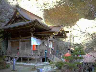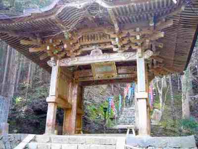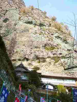 【解 説】 駐車場から、登りの参道(石段)を登って行くと、中間地点に仁王門(写真1)があり、ここの長椅子で一休み、さらに進むと、参道の脇に石仏がずらりと並んでいる所を通り過ぎ、汗だくになりながら、ふと上を見ると岩にへばりついた建物(方丈、写真2)、約20分で本堂(写真3)が見えた。登って行くにつれ、岩山がどんどん迫って来るのが凄い迫力で感じられる。本堂の右側に千人堂、水供養、方丈(納経所)があり、また本堂の左側には大師堂がある。