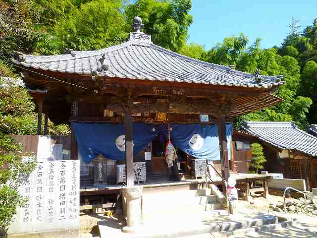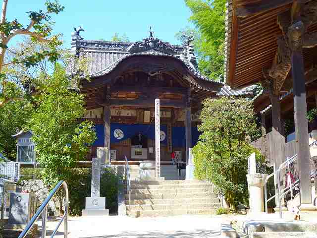 駐車場が狭く、山門はなく、駐車場横に鐘楼があり、境内もコンパクトで、正面に真新しい庫裡(ここに納経所)がある。庫裡の正面が本堂(写真1)、右側に金比羅大権現、薬師堂、大師堂(写真2)がある。