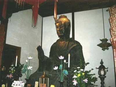 【解 説】 奈良交通バス「飛鳥大仏前」下車して直ぐに飛鳥寺前の駐車場がある。駐車場の奥に「飛鳥大仏」の標石があり、その右にわりと新しく作られた「山門(写真1)」がある。山門を入るとこじんまりした境内があり、直ぐ「本堂(安居院)」、奥に「思惟殿(写真4)」、左手前に「万葉歌碑」、「鐘楼」等がある。このお寺は、「飛鳥の大仏さん」で知られており、飛鳥寺、または安居院と呼ばれている。