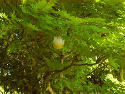 前回4月11日に参拝した時には、アジサイがまだ咲いていなかったので、再度6月13日に参拝した。アジサイ(写真4)園を歩いて、奥の院の境内で新しい発見があった。境内に小さな池があり、その池の上のモミジの木に何か綿上のものが数袋ぶら下がっているではないか。参拝客に聞くと、「モリアオガエルの卵(写真3)」で、「モリアオガエル」は、体長5〜9cmで、緑色で暗褐色班があるとのことで、わざわざ噂を聞いて、これを見に来たのだと言う。5〜6月に水辺の木の枝に泡状の卵塊を生み、その卵からかえったオタマジャクシは、下の池の水の中に落下して水生生活をし、カエルになると、発達した吸盤を使って、木の上に上って、生活をするそうだ。偶然とはいえ、珍しいものにお目にかかって、何か得をした気分になった。「モリアオガエル」について詳しく知りたい人は、http://www.hkr.ne.jp/~rieokun/frog/moriao.htm をアクセスしてください。