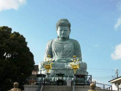【解 説】 道路に面した正面入り口から、大きな「兵庫大仏(写真1)」の姿が飛び込んで来る。これとは対照的に、入り口左側に壊れた鐘楼の土台の上に雨ざらしで置かれた鐘が印象的であった。このお寺は、能福寺としてよりも「兵庫大仏」としての方が良く知られている。この兵庫大仏は、日本3大仏の1つで、奈良東大寺の大仏(身丈14.85m)、鎌倉長谷寺の大仏(身丈11.5m)についで、身丈11.0m、台座の高さ7m、重さ60トン、総工費約5億円で平成3(1991年)年5月に再建されたものである。この兵庫大仏の初代は、明治24年(1891年)に豪商南条荘兵衛によって建立が、戦争末期の昭和19年(1944年)に金属回収の為に解体され、昭和20年(1945年)には神戸大空襲によって、伽藍が全焼した。その後、ご住職の雲井世雄師、多数の檀徒、企業等の熱意で、平成3年5月に再建された。この再建を記念して、5月9日〜10日には「兵庫大仏まつり」が行われている。