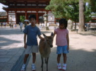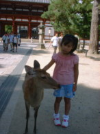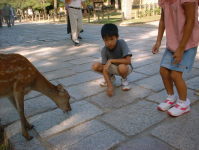 オトンが鹿せんべいを買ったとたん、鹿がいっせいに集まり えさを求めます。