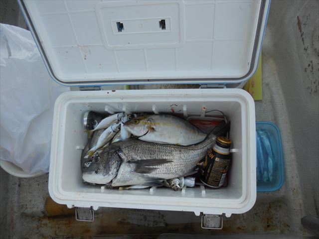 第二ラウンド、浅場でおまけに潮の動かない時間でやったフカセもどき、大アジか青物狙いのはずが 想定外の引きでチヌ!! 嬉しい大誤算でした。