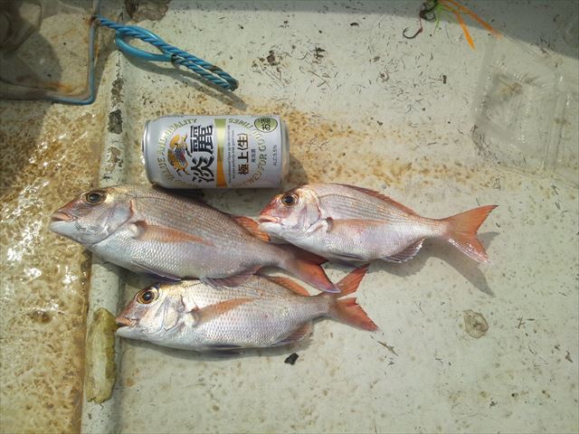 上3本はサビキ、下針に虫エサの4本針仕掛けを かたわらに置きタイラバを巻き巻き、どっちも数時間アタリなし。