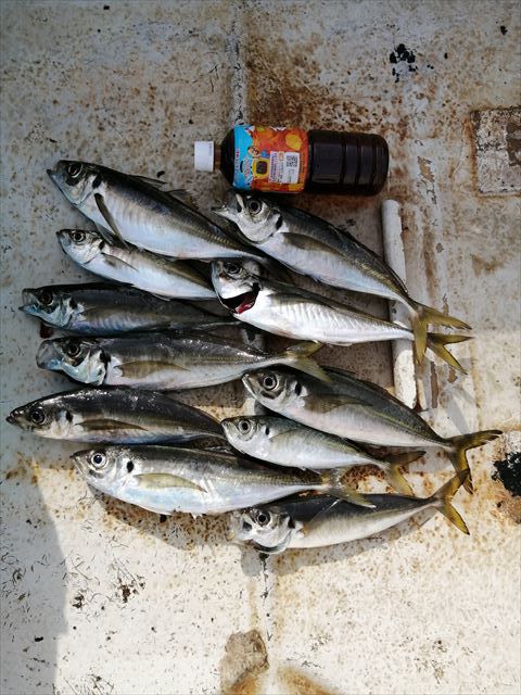 朝一、出船場所近くで良い反応があったので自作のハゲ皮サビキを入れると、鬼アジとまでは行きませんがコンスタントに釣れました。