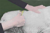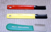 殆ど使わない と 聞いたことがあります。 そして、手で抜くのが一番いいそうです。 少量の毛をつまんで引っ張って抜きます。 お顔などは 手で抜く方が 抜きやすいと思います。 けれど、身体は 手で抜くととても時間がかかるし、たいていは ナイフを使います。(右の写真) 大きなショー会場などで色々な物が売られています。 |