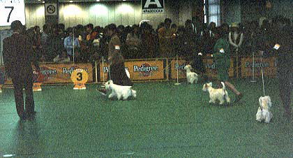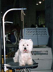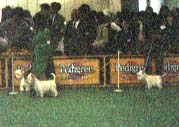 今回は、ママのハンドリングじゃないから、 ママはお写真を撮っていたよ。 ドッグショーで審査を受けているボク。 ちゃんと、尻尾も立ってるでしょ? 最初に一人ずつ審査を受けるんだよ。 台にあがって、体つきや歯の噛み合わせや ちゃんと、睾丸が2つあるかまで 見られるんだよ。変なの〜 |