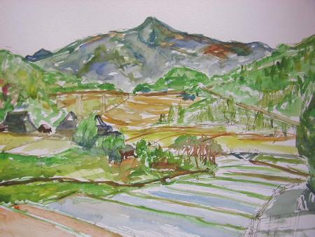 遠くに見える山が弥仙山。タカが翼を広げた感じに見える