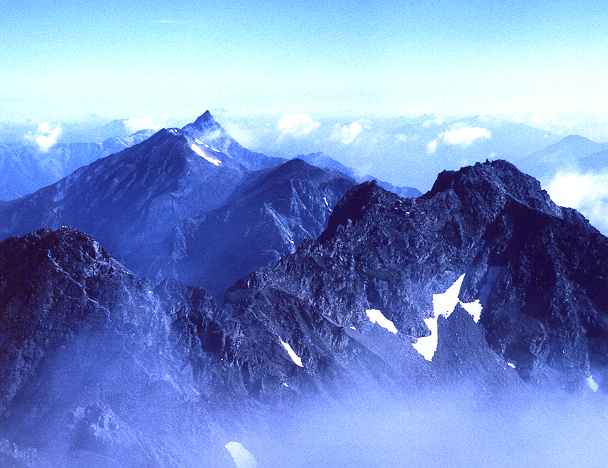 解説: 私のもう一つの趣味が登山である。 今から10年以上も前になるが、蝶が岳,常念岳を手始めに、双六岳、奥穂 高岳と、北アルプスの峰々を歩き回った時代があった。 「山の写真も良いかもしれない。」と始めたことであるが、カメラ機材の重 さにはどうにも勝てず、また、一時健康を害したこともあって、数年で写真 目的の登山は断念してしまった。 健康を取り戻した現在では、山の空気,爽快感を楽しむ登山、いわゆる中高 年登山の領域を楽しんでいる。 ここに掲載した写真は、1990年、奥穂高岳に登った時のものである。 その日の朝、穂高岳山荘は濃いガスに包まれていた。 山荘を出発して一時間ほどで山頂に到着。案の定、あたり一面乳白色の世界 でなにも見えない。「やっぱりダメか...」ほとんどあきらめ気分の私達 であった。とりあえず何枚か記念写真を収め、小休憩へ。 どのくらい経っただろうか、にわかに回りがざわめきだした。なんだろうと、 あたりを見回すと、なんとガスが吹き飛ばされていくではないか。振り返る と、いつのまにか槍ヶ岳が...。 なんという好運。あわててカメラをセット。シャッターを切った。 濃かったガスが嘘のよう。あっという間に眼下に大展望が広がった。 北アルプスの峰々から、南アルプス,御岳,白山、遠くは富士山まで見える。 悲壮感が漂っていただけに、感激ひとしおであった。 それまでは気がつかなかったが、ふと見ると、頂上直下から今まさにパラ グライダーで飛び立とうとしている人がいる。「エッ! まさか。」 その“まさか”であった。タイミングを見計らって大空にダイブ。 そのカラフルな傘は見る見るに小さくなり、豆粒のようになって上高地に吸 い込まれていった。私たちは、ただただ呆然と見送るのみ。 「すごい人がいるものだ...。」 その後、重太郎新道を下って岳沢小屋へと。小屋に着いたときには、汗び っしょり、バテバテ状態であった。 パラグライダーがうらやましい限りであった。 写真の左端が涸沢岳。右の頂が北穂高岳か。後方には槍ケ岳が見える。 さて、今年はどこに登るか....