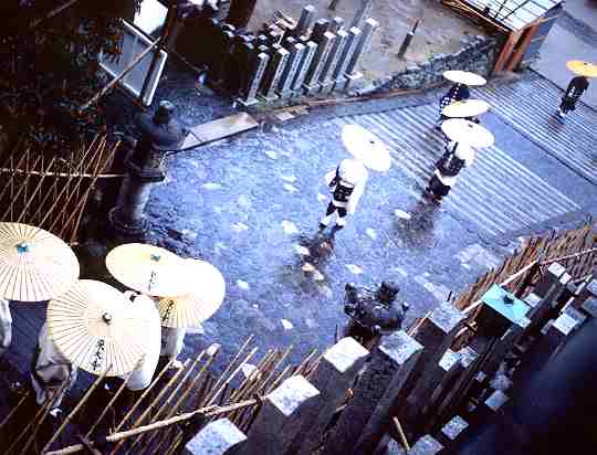 解説: 奈良には数多くのお寺があるが、話題となるとどうしても東大寺中心に なってしまう。 東大寺との出会いは、12年前にさかのぼる。 奈良大和路の風景写真を撮りはじめて7年、それまでに撮り溜めた作品を なんとか発表できないものかと、当時新宿にあったオリンパスギャラリー に写真展開催の申し込みを行った。奈良の風景写真は多くの人に撮られて いることから、審査に通るのは難しいだろうとそれなりの覚悟はしていた が、幸運にも合格し、開催許可をいただくことができた。 さて、会期がはじまってまもなくのことであったが、中年の女性が会場 にみえ、ひとしきり見て回ってたあと、ある1枚の写真をじっと見ておら れる。そして、タイミングを見計らって私のところにやって来て、記帳し ながら一言。 「〇〇さんよく写ってますね。」 「はあ....」 写真展に出展した写真は70点ほどであったが、ほとんどが風景写真。 かろうじて巫女さん,お坊さんの写真が数点含まれていた。 その写真はその中の一枚。修二会に参籠されているお坊さんの姿を撮った ものであった。 当時の撮影対象はお松明が主体。法会そのものには全くといっていいほど 興味がなく、お坊さんの名前など知るよしもない。 私が理解してないと見て取るや、「あの方は〇〇さんと言って...」と、 そのお坊さんの話しが始まった。 「ま、マズイ...」 人が写っている写真は肖像権の問題があり、展示しづらいものがある。ま してや東大寺のお坊さんともなればなおさらである。写真を選ぶ際そのあ たりが気になったが、会期はたったの一週間。「まあ大丈夫だろう」と、 たかをくくっての出展だった。これはマズイなあと思いながらも、その人 の話しをうかがった。 すると、その女性の口から、次から次とお坊さんの名前が出てくる。めち ゃくちゃ詳しいのである。そして、是非、外だけでなく、修二会の中を撮 れとすすめる。 そう言われても、私は風景写真専門、人物などほとんど撮った事がない。 それに、修二会は厳粛な行。とても撮れるものではない。 その場は、それなりに話しを合わせてやり過ごしたが、その翌日もやって 来て、今度は知り合いのお坊さんにDM葉書(写真展開催の写真入りの案 内葉書のこと)を送ったという。ますますマズイことになった。さらにそ の後も、このお坊さんを訪ねて行けと写真まで持って来られる。 さすがに、私もここまでされると下がるに下がれない。結局、挨拶に行か ざるをえなくなった。 会期終了後、紹介されたお坊さんを訪ねた。 場所は、二月堂横の寺務所。通されたのは奥の応接室。お茶とお菓子を出 され、それはもう緊張の極値であった。 これが、東大寺との出会いである。 その後、私がおかしな者ではないと分かっていただいたようで、翌年から 修二会の撮影許可証をいただくようになった。おっかなびっくりではあっ たが、それから10年にわたって修二会を撮ることとなる。 この写真は、修二会の最終日、3月15日の昼過ぎくらいに撮影したも の。全ての行法を終え二月堂を下る場面である。春の嵐とでも言おうか、 その日はすごい風雨で、石段を下るお坊さんの列が乱れた。 先を行くお坊さんには「待って待って」と、後のお坊さんには「早く早く」 と、心で叫びながら捕らえた一枚である。