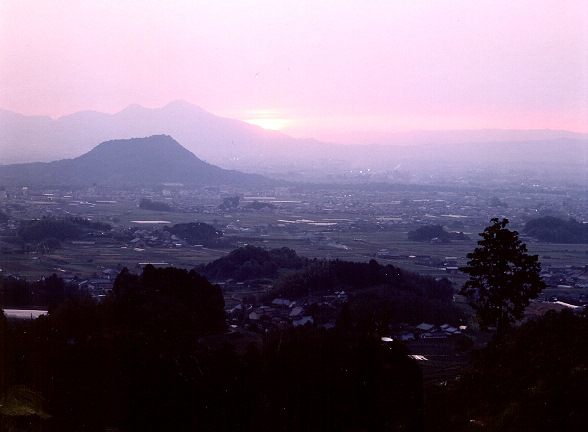 解説: 桜井市高家地区から眺めた飛鳥の夕日である。 眼下には八釣の里、正面に畝傍山、さらにその後方には二上山。今まさに その二上山に日が沈もうとしている。 二上山は奈良盆地の南西、奈良県と大阪府の間に位置し、ラクダのコブ のような二つの峰からなる山である。奈良県側から見て右側の峰を「雄岳」、 左側のちょっと低めの峰を「雌岳」と言い、雄岳山頂には、悲劇の皇子 大津皇子の墓がある。 この山に沈む夕日を最初に撮ったのが、奈良を代表する写真家、故入江 泰吉さんである。入江さんは、「大津皇子の怨霊を写真で表現したい。」 という思いを持たれ、多くの写真を撮られてきた。その作品たるやものす ごく、多くの人を魅了し、結果、この山の存在を世間に知らしめることと なる。 撮り方は基本的に、雄岳,雌岳の真ん中に太陽を沈めてやるというもの。 思い通り鞍部に沈めればしてやったり。さらに、それが素晴らしい夕日で あったらいうことない。どこか、パチンコのチューリップに似ているもの を感じる。(私はパチンコはやらないが...) 撮影場所は、おおよそ天理市周辺から明日香村あたりまでであろうか。 まずは冬至。このころの太陽は南に傾いて沈むので、その位置と二上山を 結んだ線を延長したところ、つまり、天理市あたりに場所を探すことにな る。どこでも良いという訳ではなく、絵になりそうなところでなければい けない。まずは山の辺の道、崇神天皇陵あたりか。ここが2月22日前後。 次が桧原神社境内。ここが3月11日。春分の日は太陽は真西に沈むので、 撮影場所はその真東、大神神社あたりとなる。(ただし、真西に沈むのは、 太陽が地平線に達した時。山に沈む太陽は、沈んだように見えても、まだ 山の後ろ(上空)にあるので、若干補正して考える必要がある。つまり、 太陽は南から斜め45度の角度で沈んでいくので、その時点ではまだ真東 には達していないことになる。)その後、桜井市を通過。4月の下旬には 明日香へと入る。高家が5月初旬。甘樫の丘が5月12日。岡寺周辺が 6月上旬。そして最後が石舞台あたりとなる。それが6月下旬、つまり夏 至である。 その日を境に、太陽は来た道を南下。逆に、カメラマンは北上していくこ とになる。 当時は、奈良に行くたびにこのような夕日をねらったものだ。しかし、 今から思えばなにも二上山にこだわる必要などなかった。ネコも杓子も、 大津皇子の怨霊を撮っていてもしょうがなく、それは入江さんにまかせて しまえば良いことではなかったか...。真似ではなく、自分独自の作品 を残せば良かったのだ。しかしながら、それに気づくまでに10年も掛か ってしまった。 先日、本屋で二上山の夕日の特集が組まれた本を見つけた。あるカメラ マンがひたすら二上山に沈む夕日を追っかけているという。いまだに、撮 り続けている人がいるのには驚いた。紙面には数十枚の写真が載っていた が、どの写真を見ても平凡な写真に思えてならなかった。 昔はこういう写真を見せられると目の色が変わったものだが、なんの感動 も感じないのは不思議である。 月日の流れは、こうも人の心を変えてしまうものなのか.... ご参考: 大津皇子とは、天武天皇と大田皇女との間に生まれた皇子。大田皇女は早 くに死亡。その妹“鵜野皇女”(後の持統天皇)が権力を持つようになる。 鵜野皇女は我が子、草壁皇子を皇位に付けたいと願うが、どうしても大津 皇子が邪魔な存在である。そこで一計を案じ、謀反の疑いで大津皇子を捕 らえ、自殺に追い込んでしまう。その後、病弱であった草壁皇子は28歳 という若さで病死。その息子、軽皇子が皇位を継承、文武天皇となる。 刑死に処せられる時、磐余(いはれ)の池の堤で悲しんで詠んだ大津皇 子の歌 「ももづたふ磐余の池に鳴く鴨を、今日のみ見てや雲隠りなむ」 さらに、姉の大田皇女の、弟の死を嘆き悲んで詠んだ歌 「うつそみの人にある我れや明日よりは、二上山(ふたかみやま)を弟背(い ろせ)と我が見む」は広く知られている。